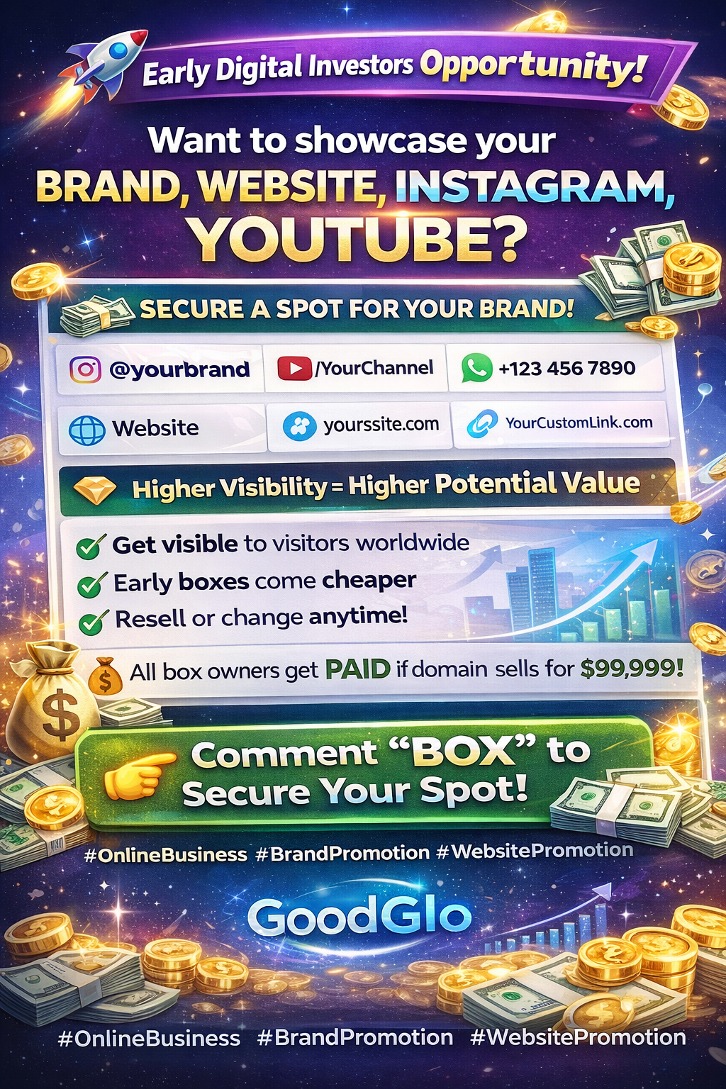 Now you can secure your exclusive brand box on GoodGlo homepage and get visibility from visitors worldwide.